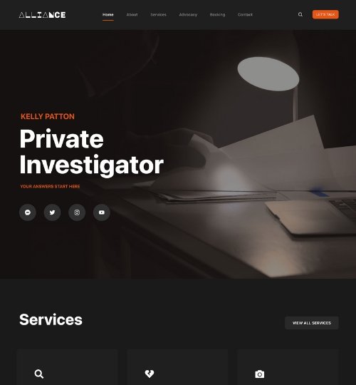 A bold, dark-theme, high-credibility private investigator site with detailed service pages, consultation booking, newsletter/lead-capture form, and built-in donation links.